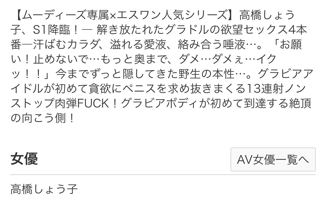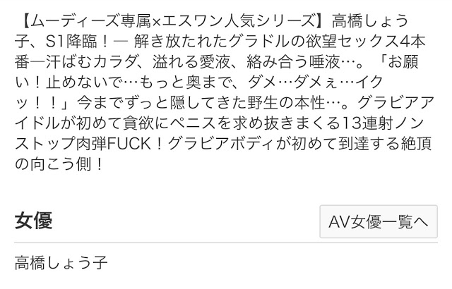 其實不用緊張也不用害怕S1會變成一家獨大的超級邪惡帝國,因為這支作品發售的日期是12月1日、作品標題前面也特別標了「ムーディーズ専属×エスワン人気シリーズ」,所以很明顯了,這是一個跨片商的合作,雖然發片的是S1、不過一切都還是配合片商Moodyz,不只發片的日期如此、標題更是註明了高橋しょう子(高橋聖子)的身分歸屬: