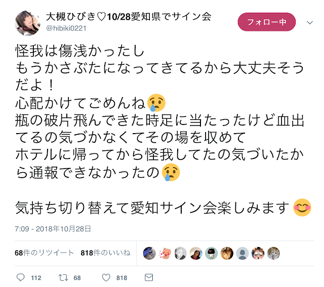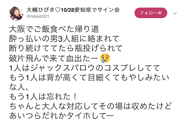 人在大阪、才剛發行出道10週年作品的大槻ひびき(大槻響)在twitter自爆在吃完飯後遭到醉漢三人組糾纏,結果被他們丟過來的酒瓶醉片擊中,見血了!