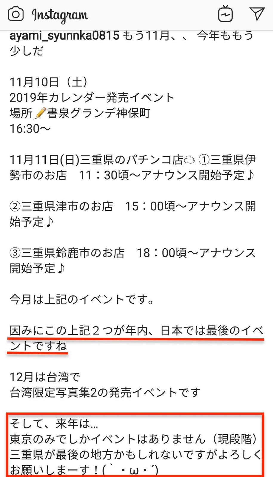 11月11日,她要離開東京行軍去三重縣舉辦活動,然後她今年的活動就全部結束了;另外,她也告訴大家這次在三重縣的活動是她最後一次在非東京地區露臉(指日本,12月她會來台灣),要看她請把握機會…