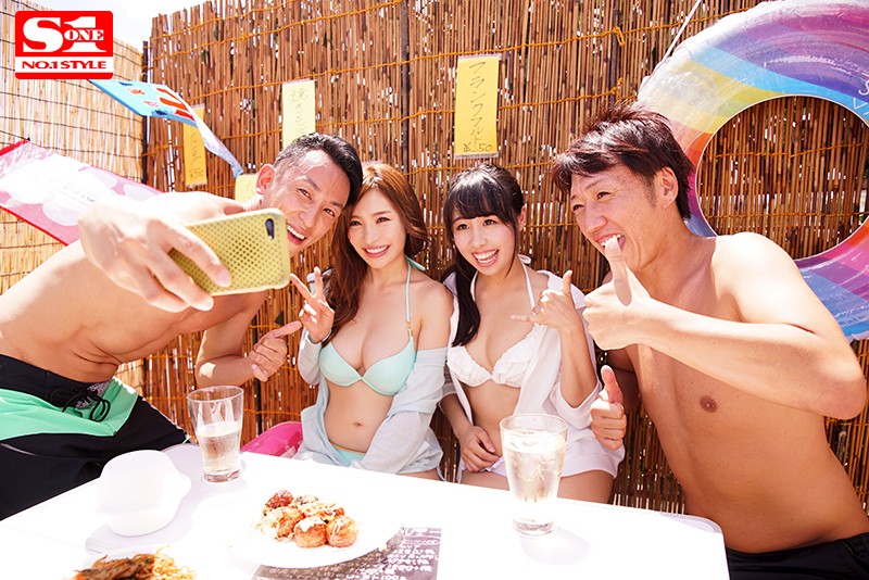 這是新作「絶対にお持ち帰りできる海の家ナンパ相席居酒屋」的內容:葵是和好朋友一塊兒去了海邊玩,在居酒屋用餐的時候被兩個高大帥氣又粗又長的男優搭訕,結果四個人相談甚歡,就開了房間進行下半身的交流~