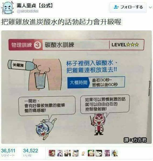 圖中表示,將雞雞浸泡在碳酸水中約 30 秒,可以提升男人的[性·能·力]。一開始雖然有點痛,但長期練習過後,就能自由自在的控制發射!真的還假的?