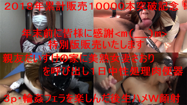 タイトル: 祝!2018年累計10000本突破記念!年越し前に感謝祭!親友大輔の家にさおりを呼び出し1日中性処理肉便器にさせ生ハメW顔射!レビュー特典に豪華!お好きな作品1つプレゼント!