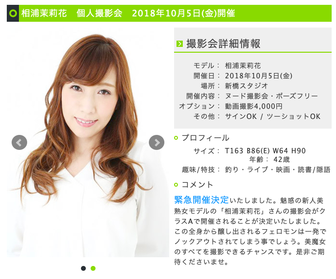 這邊有張她在攝影會的照片,看起來42歲的年齡是真的,但宣傳影片沒上線所以很難判斷本人到底老到什麼程度;但我也坦白說,以相浦茉莉花在攝影會的價格來看她等級並不是很高,但那是因為她太老還是太醜我就不知道了…
