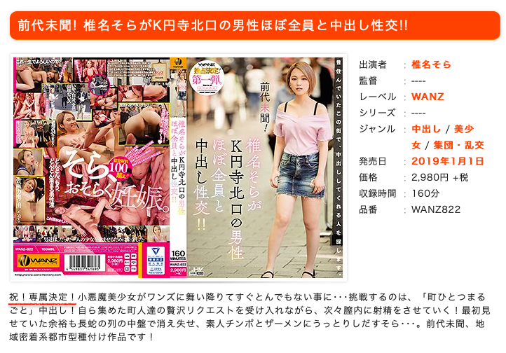 為什麼呢?因為椎名そら(椎名空)這支作品「前代未聞! 椎名そらがK円寺北口の男性ほぼ全員と中出し性交!!」的文案第一句就是「専属決定」,也就是說在つぼみ(蕾)和Julia後,椎名そら(椎名空)現在是要加入ワンズファクトリー(Wanz Factory)、成為這家片商第三位專屬女優…
