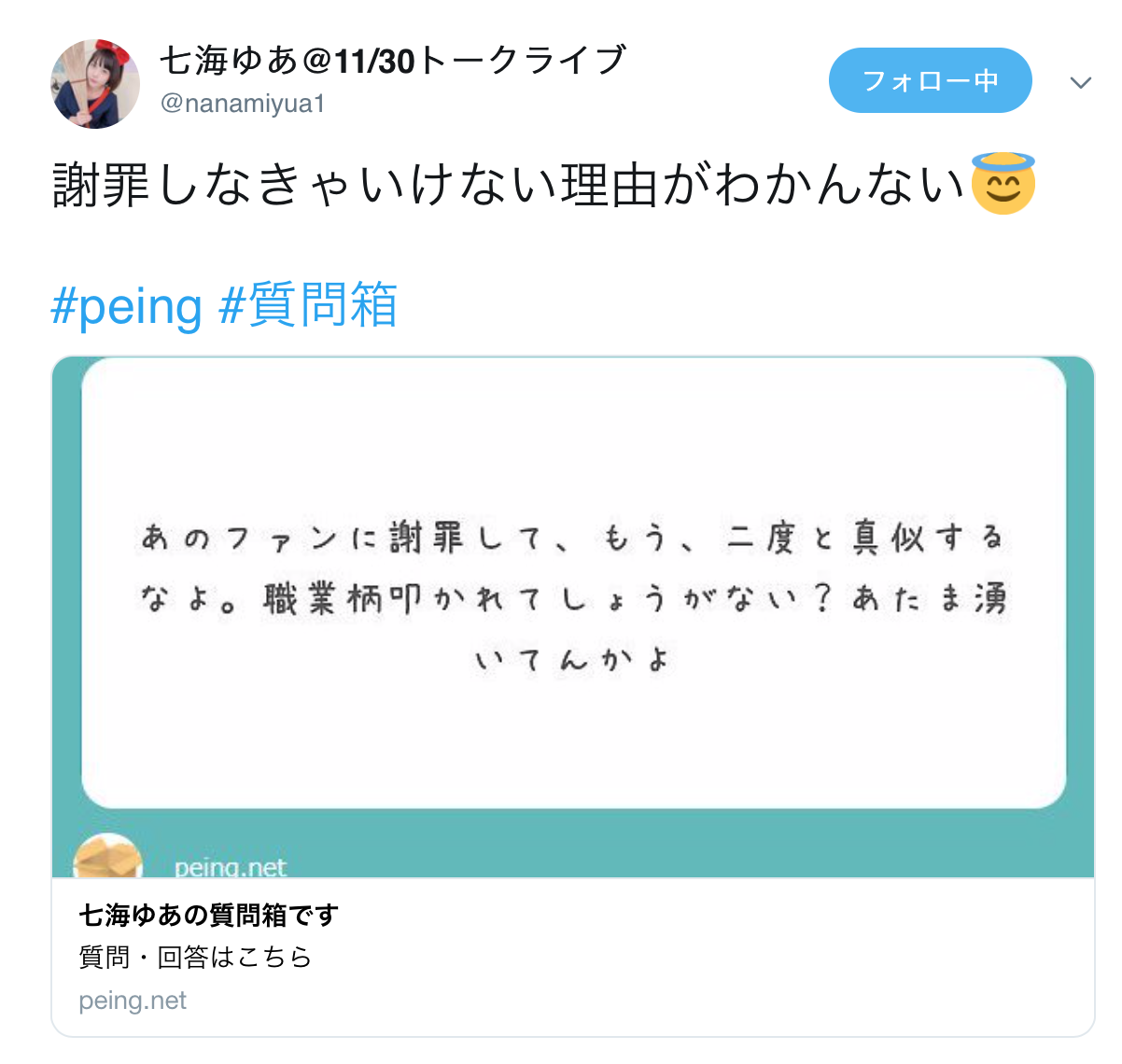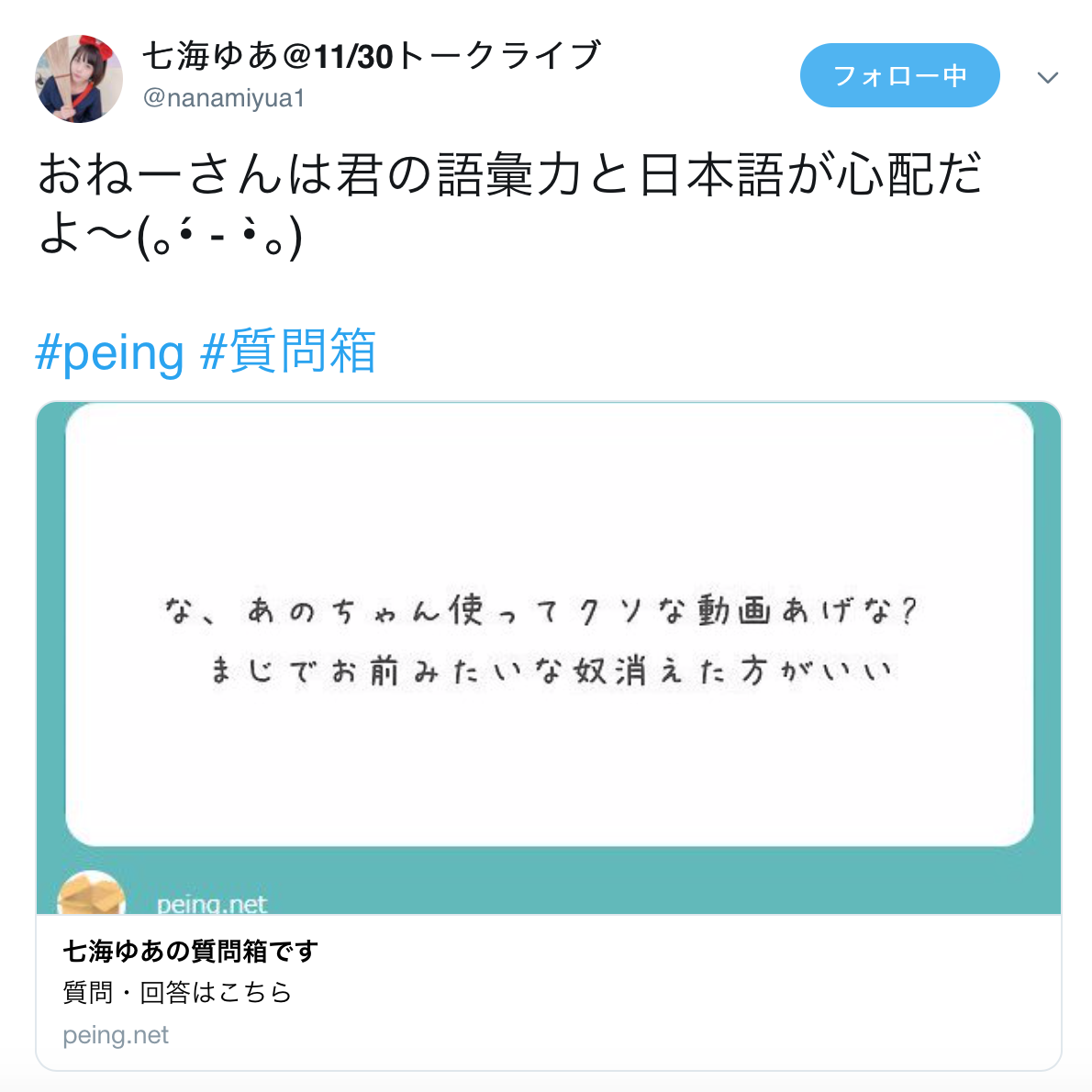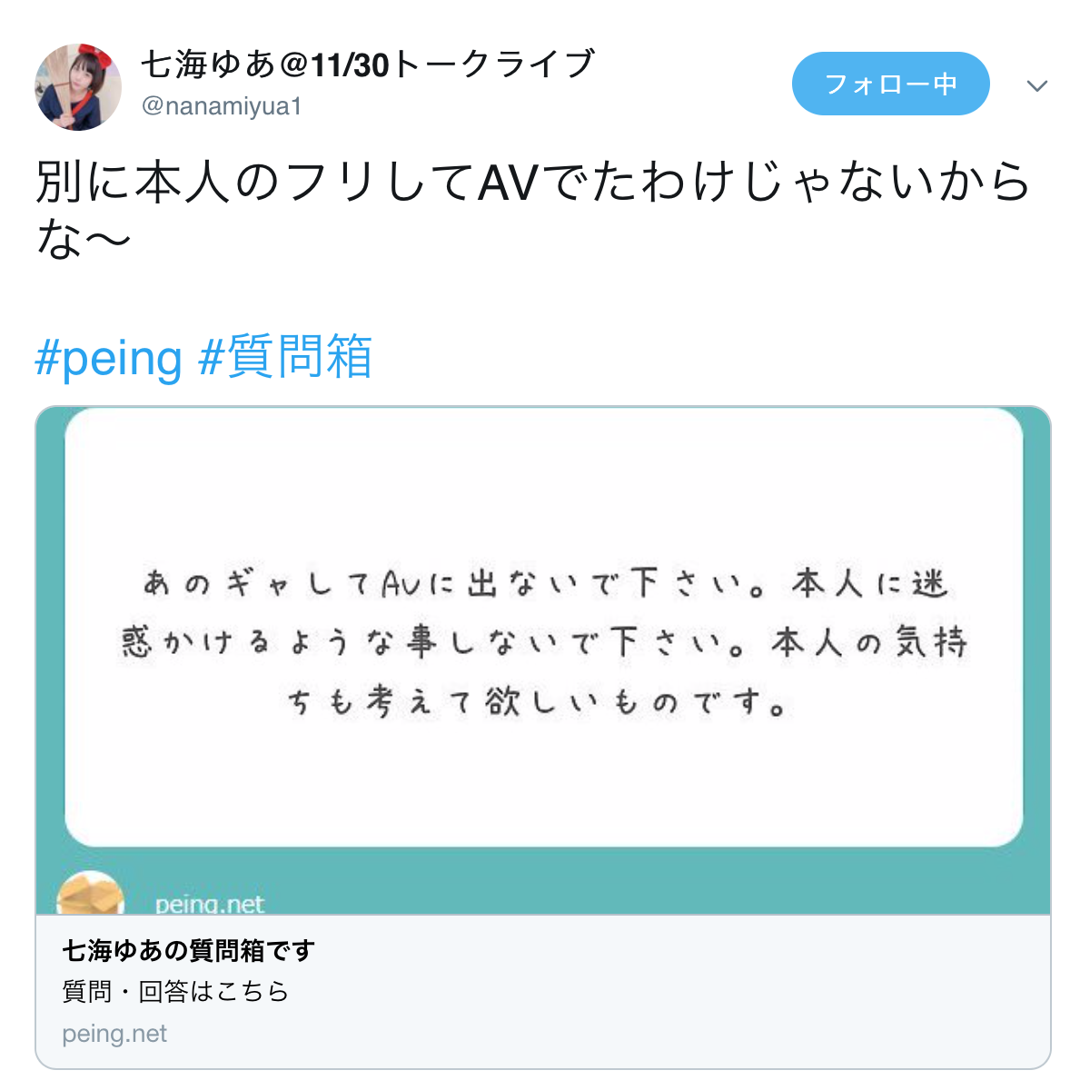 透過質問箱的功能,ゆるめるモ!的粉絲瘋狂辱罵七海ゆあ(七海由愛),但這位女優可是不甘示弱,不管那群粉絲怎麼罵她總是有辦法酸回去:
