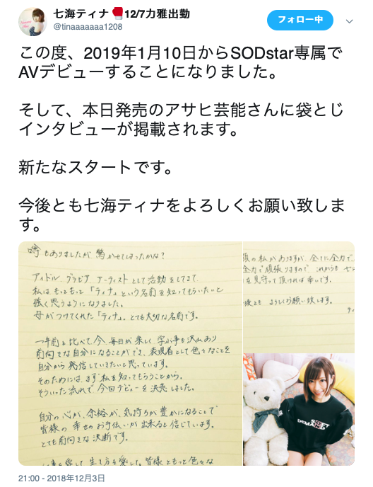 以經紀公司的歸屬來看,七海ティナ(七海蒂娜)就是去接飛鳥りん(飛鳥鈴)畢業後留下的空缺,而且就像上次筆者解密她身分時說的一樣,除了拍過寫真、當過偶像以及是恵比寿マスカッツ(惠比壽麝香葡萄)的成員外,她在AV界出道的作品「凛として儚い 七海ティナ AV DEBUT」還強打她身體的曲線美並且說她是「絶品エロリッチボディ(絕品情色Body)」: