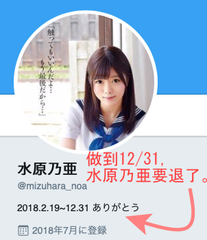 她已經在twitter的自我介紹欄打上「2018.2.19~12.31 ありがとう」(2018.2.19~12.31謝謝大家),前面2月19號是她出道作上架的日子,後面的12月31日指的自然是她封鮑不幹的離職日…