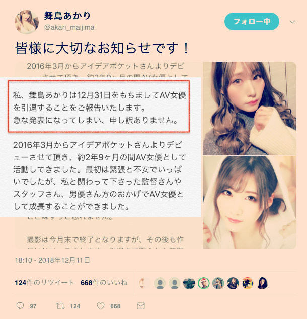 昨天才看到水原乃亜在twitter上告訴大家就做到12月31日為止,但你知道,我知道,獨眼龍也知道,要退休的女優還有很多很多,在昨天,隸屬於事務所All Promotion的舞島あかり(舞島明里)也無預警地在twitter上發表引退聲明: