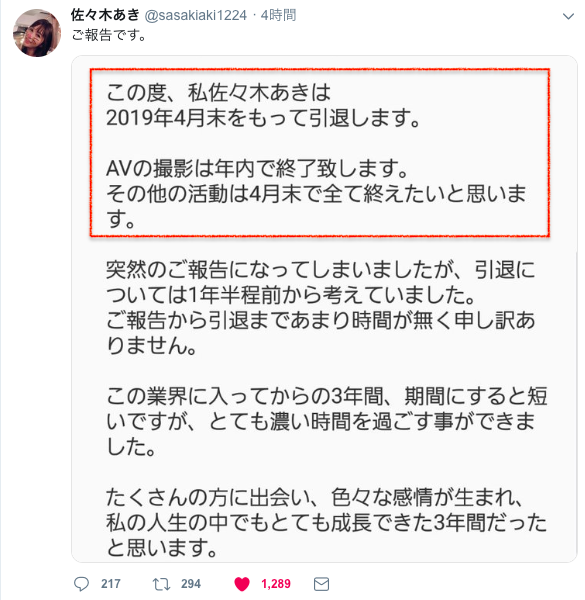 再會了,我心目中最強的輕熟女,不管妳是因為厭戰還是其他原因引退、不管你是真的離婚還是為了造勢把出道的設定當故事繼續說下去,我都衷心感謝妳這些年來的付出;希望妳拋棄了佐々木あき(佐佐木明希)這藝名後能得到想要的幸福,真的。