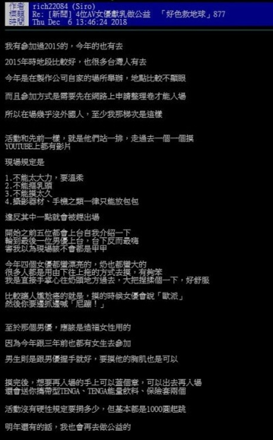 除了可以感覺到宛如自己是AV男優的臨場感,這種男人腦中幻想的劇情終於在這一天實現了,日本媒體報導著,女優整齊排成一排,兩手撩衣露胸、面露微笑,讓捐款人士盡情的搓揉,由於是公益活動,許多人參加後表示:
