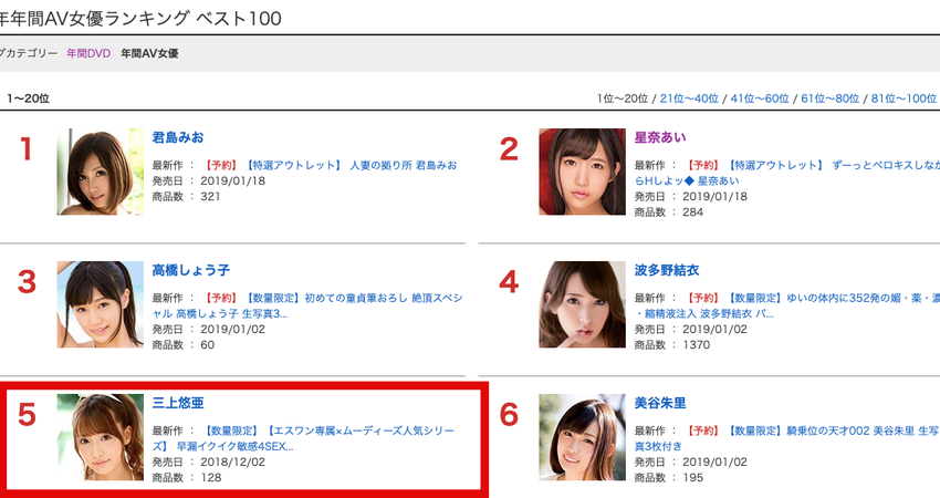 答案是,她打進銷售百大的作品並不多,「只有」3支,其中還有1支是精選輯;但還好,在累積銷售的排行榜她成績依舊不錯,排在第5,論專屬女優的話只輸給高橋しょう子(高橋聖子),如果榜單沒有造假那她還是滿厲害的…