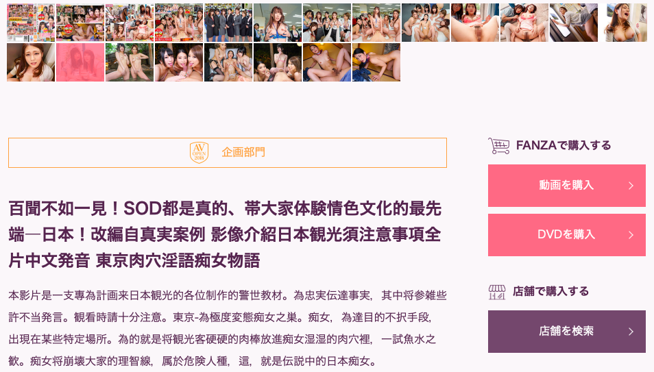 這支作品叫做「百聞不如一見!SOD都是真的、帯大家体験情色文化的最先端―日本!改編自真実案例 影像介紹日本観光須注意事項全片中文発音 東京肉穴淫語痴女物語」,幹,這不是我翻譯完後的片名,而是全中文發音的作品,接下來看作品說明大家就知道了ー
