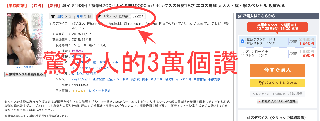 不只如此,她在11月發售的作品「激イキ193回!痙攣4700回!イキ潮10000cc!セックスの逸材18才 エロス覚醒 大大大・痙・攣スペシャル」更是獲得日本影迷一致好評,在FANZA、就是以前的DMM的影片下載賣場拿到了超過32000個讚,躍居史上第三的位置: