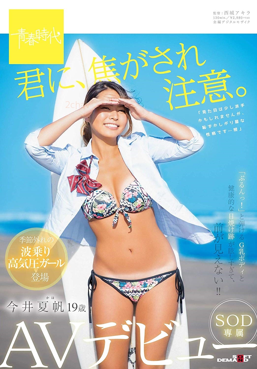 和衝浪板同框拍封面照的她怎麼看都很不「青春時代」,不只是感覺不對,最重要的今井夏帆根本不像是這家片商會用的女優:成熟的臉蛋、火爆的G罩杯身材再加上三點留白的人肉比基尼膚色…哇哩勒,要不是她在片中有穿上學生服和男優辦事,要不然我還真以為她和西条沙羅一樣是做救生員的…