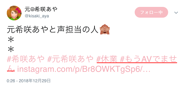 和其他女優不太一樣,希咲あや(希咲彩)並沒有口出「引退」兩字,只說自己是與事務所合約到期了;不過大家可以去她的twitter瞧瞧,她不但把名字改成了「元☺︎希咲あや」,同時也在置頂的推文標籤上「#休業」以及「#もうAVでません(不再拍片了)」,意思就是說她不拍AV了!
