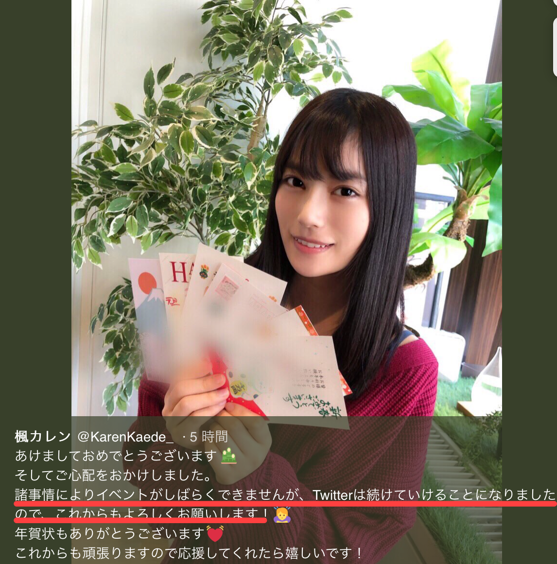 這篇文章的重點就是「因為各種狀況所以我(楓カレン)暫時沒辦法參加活動了,但twitter會持續更新,請大家多多指教」ー