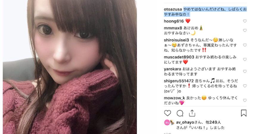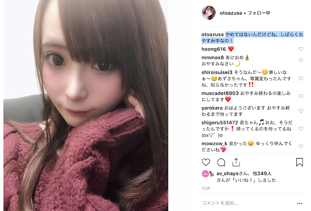 其實這位號稱臉蛋不輸演藝圈偶像的美少女並沒有完全消滅,因為她昨天更新了IG,寫了「やめてはないんだけどね、しばらくおやすみ中なの!」,意思就是「我沒有不做、只是暫時休息一陣子」: