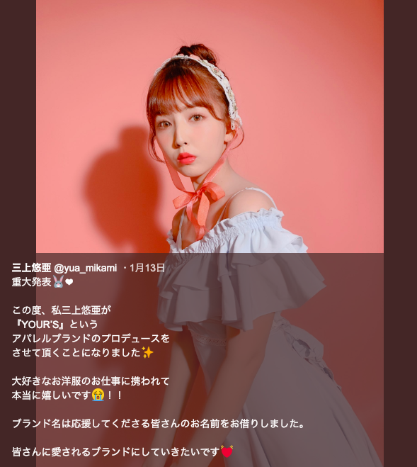 那就是華人圈第一偶像「三上悠亜」,在昨天,她在twitter宣布成立自有的服裝品牌「YOUR’S」:這個品牌名不只是「你的」也可以解釋為「悠亜的」(悠亜的日文讀音是Yua,和Your相近),在之前,這個YOURʻS是三上悠亜的粉絲暱稱,到了現在,三上悠亜決定要將這暱稱發揚光大,讓大家都能和她一樣穿得漂漂亮亮的~