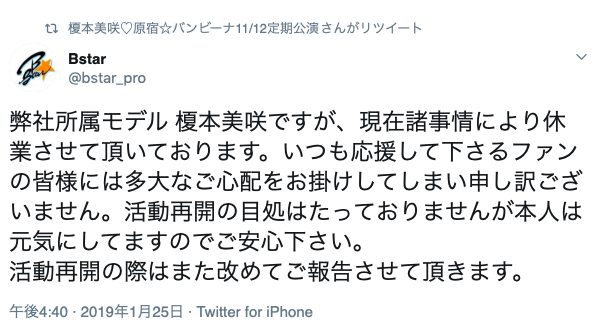 假如真的是被家人抓到,那恐怕榎本美咲真的會如事務所發文說的「歸期未定」了: