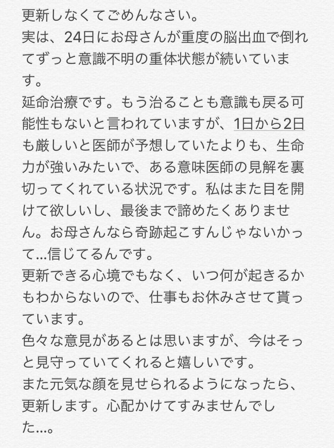 可能有些人注意到她自1月24日後就暫停更新twitter及IG了,雖然也才一個禮拜左右沒什麼好大驚小怪,不過原因她自己講了,是因為母親嚴重腦出血,目前意識不明、恐怕會有性命之憂…