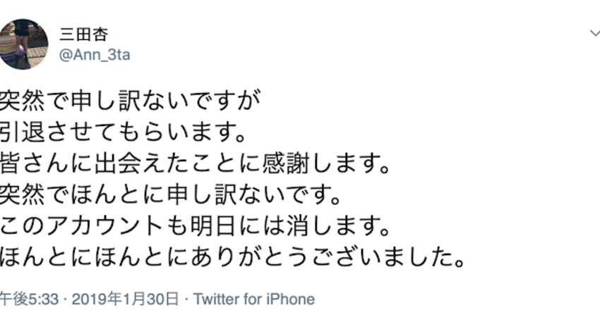 這是一篇再正常不過的引退聲明,女主角「三田杏」告訴大家她要引退了,twitter帳號也將在今天(1/31)刪除……