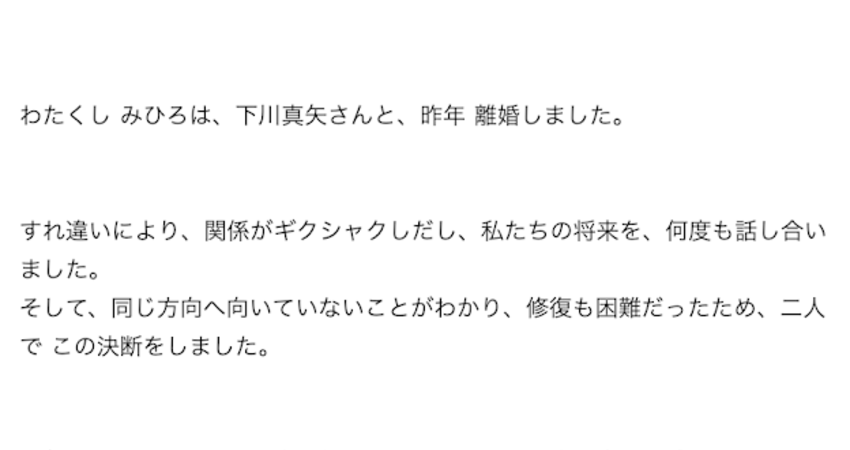在文章裡みひろ(Mihiro)是這麼說的:近來,與老公的關係有些摩擦,經過幾次對話,確定雙方對將來的方向並不一致,關係修補也非常困難,最後,兩人做出了(離婚的)決定…