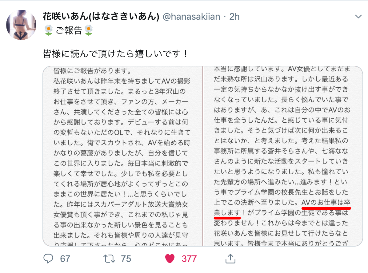 她在twitter上公開說了,在完成去年年底的拍攝工作後就暫時封鮑了,雖然下海當AV女優讓生活過得更加刺激也讓她拿下最優秀熟女的獎項、甚至還因為影迷的加油把她的孤獨感一掃而空,但現在是該停下腳步的時候了,所以在文章的最後花咲いあん(花咲一杏)講得很清楚了: