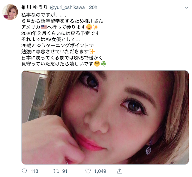 這位曾經是恵比寿マスカッツ(惠比壽麝香葡萄)的一員、身材肉感奶又大的女優是在twitter上告訴大家她要去美國遊學了,要明年(2020)2月才會回到日本,在這段期間她必須要暫時休業不拍AV了~