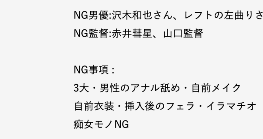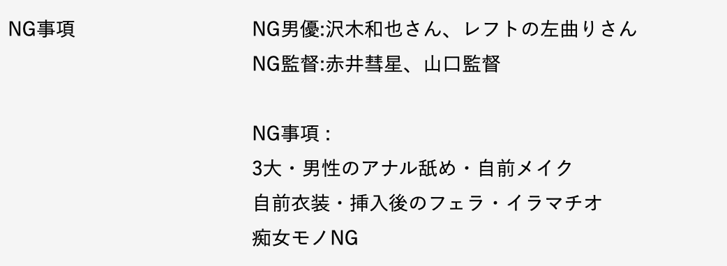 是誰就不用說了,從這張截圖就知道該女優不但有拒絕合作的男優也有不想共事的監督(導演),在演出上也有一堆規矩(不舔男優的菊花、不自己化妝、插入後就不替男優口交…),雖然她曾是市場上最強的發片機器之一,但可能會有些朋友會覺得這位女優「很機車」。