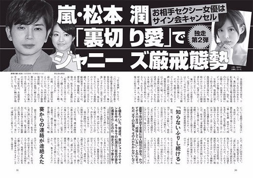 松本潤和葵司交往4年每週最少見面一次,「週刊文春」今期作出跟進報導,表示報章和電視完全沒有報導這新聞,和前年松本潤和井上真央進行燒肉約會時一樣,被某強大力量封殺。(指的是傑尼斯事務所壓下整個事件)