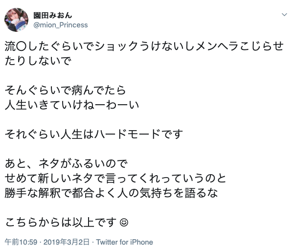 園田みおん(園田美櫻)的反應大概能說明那些被流出片露出下面的女優在想什麼:她說現在已經沒有因為流出片而感到震驚與沮喪,也很討厭影迷把她心情不好和流出片做連結,現在她只想說:「換個話題、別再提流出了吧!」