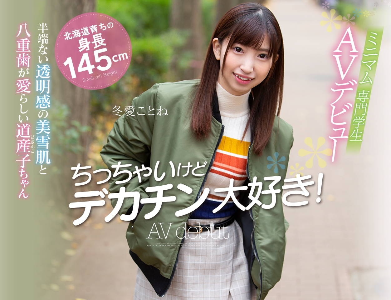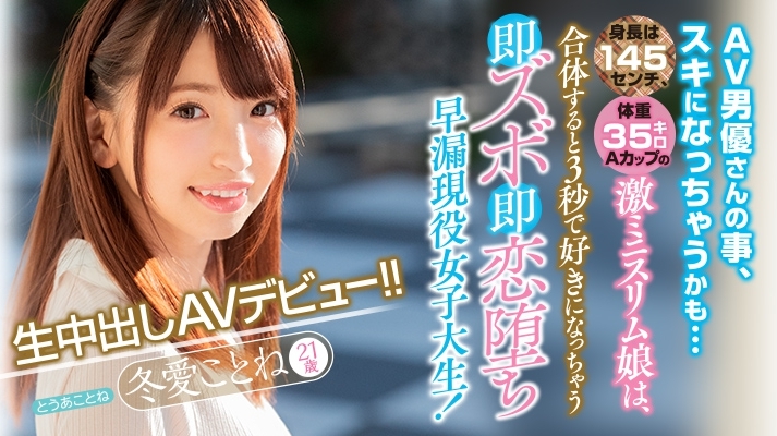 這位號稱「超愛歐吉桑」的美少女系新人是WILL集團(北都)3月25日檔的大紅人,三家主力片商kawaii*、本中以及ナンパJAPAN都能看到她的身影。當然,三家片商的玩法不同,冬愛ことね(冬愛琴音)扮演的角色也有差異:在Kawaii*,她是個想要和大雞雞正面對決的勇者;到了本中,她則是搞完就愛上AV男優的奇女子;而在搭訕片商ナンパJAPAN,這位有著可愛小虎牙的女孩則是從北海道到東京、在網咖被釣來的美少女,以為有個地方可以好好休息的她想不到打開門竟然是一堆人要陪她睡,就這樣一個晚上不斷地被深入淺出~
