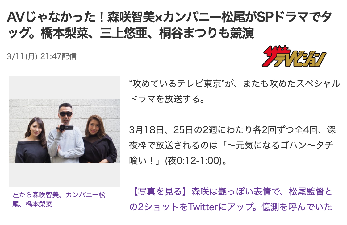 果然不是AV,而是カンパニー松尾(Company松尾)進軍電視界的新戲「~元気になるゴハン~タチ喰い!」,這是カンパニー松尾(Company松尾)首次進軍電視界的作品,劇情簡單地說就是中華一番的深夜版,由男主角的主觀視角與一個又一個襲來的美女刺客用美食決勝負,共4集。