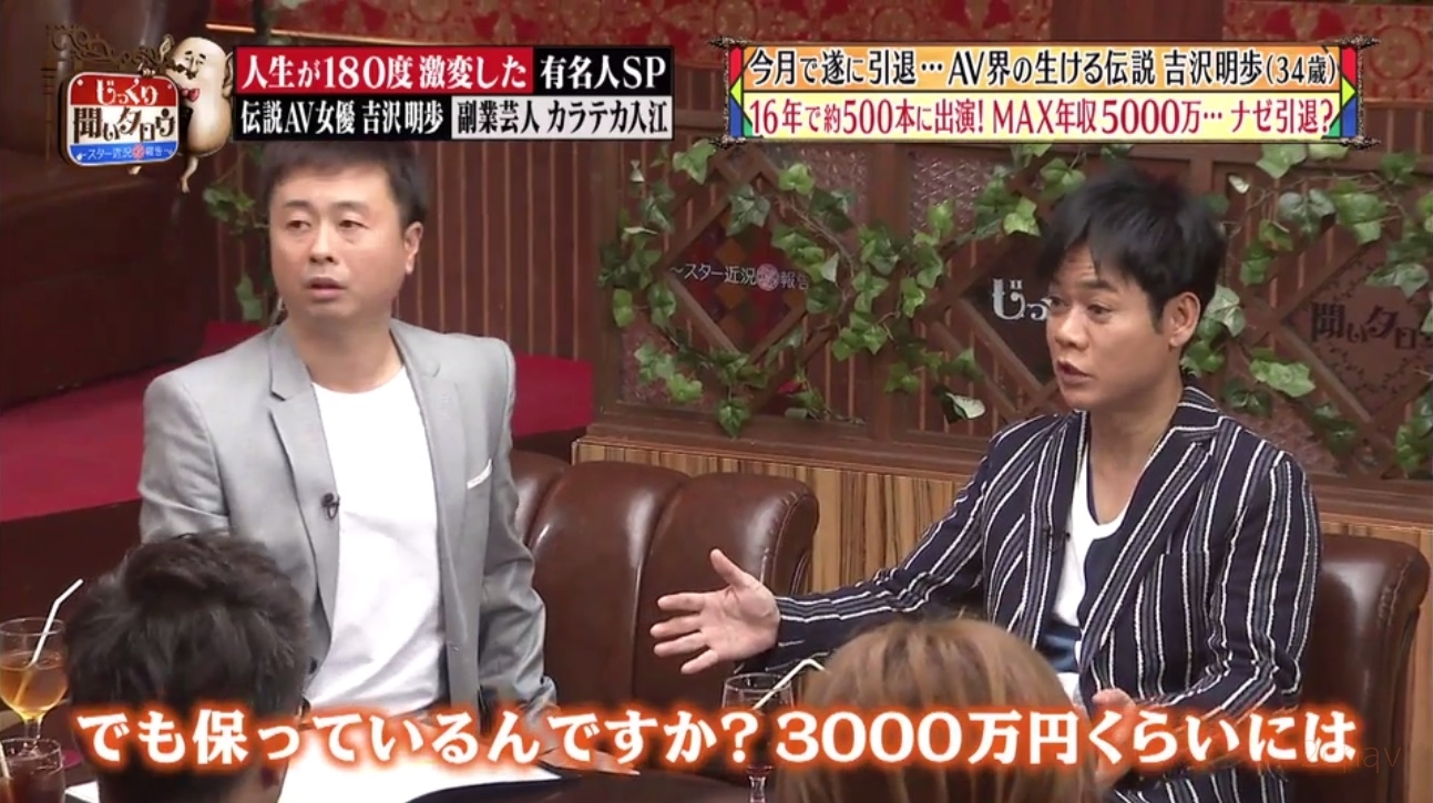 幹,難怪經紀人要強力慰留叫吉沢明歩再撐一下,這棵搖錢樹搖一搖掉下的都是元寶;不過吉沢明歩也說這幾年已經沒賺那麼多了,而在主持人的追問之下她是默認一年仍然可以賺到3000萬日幣(約台幣833萬)…