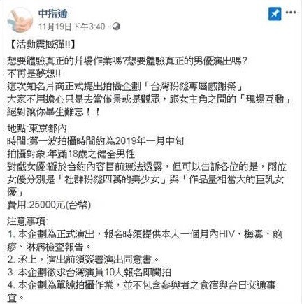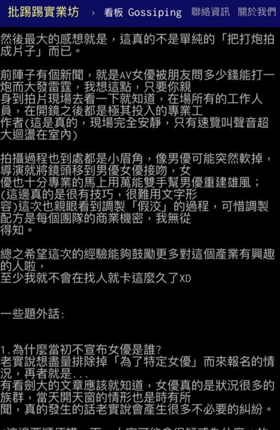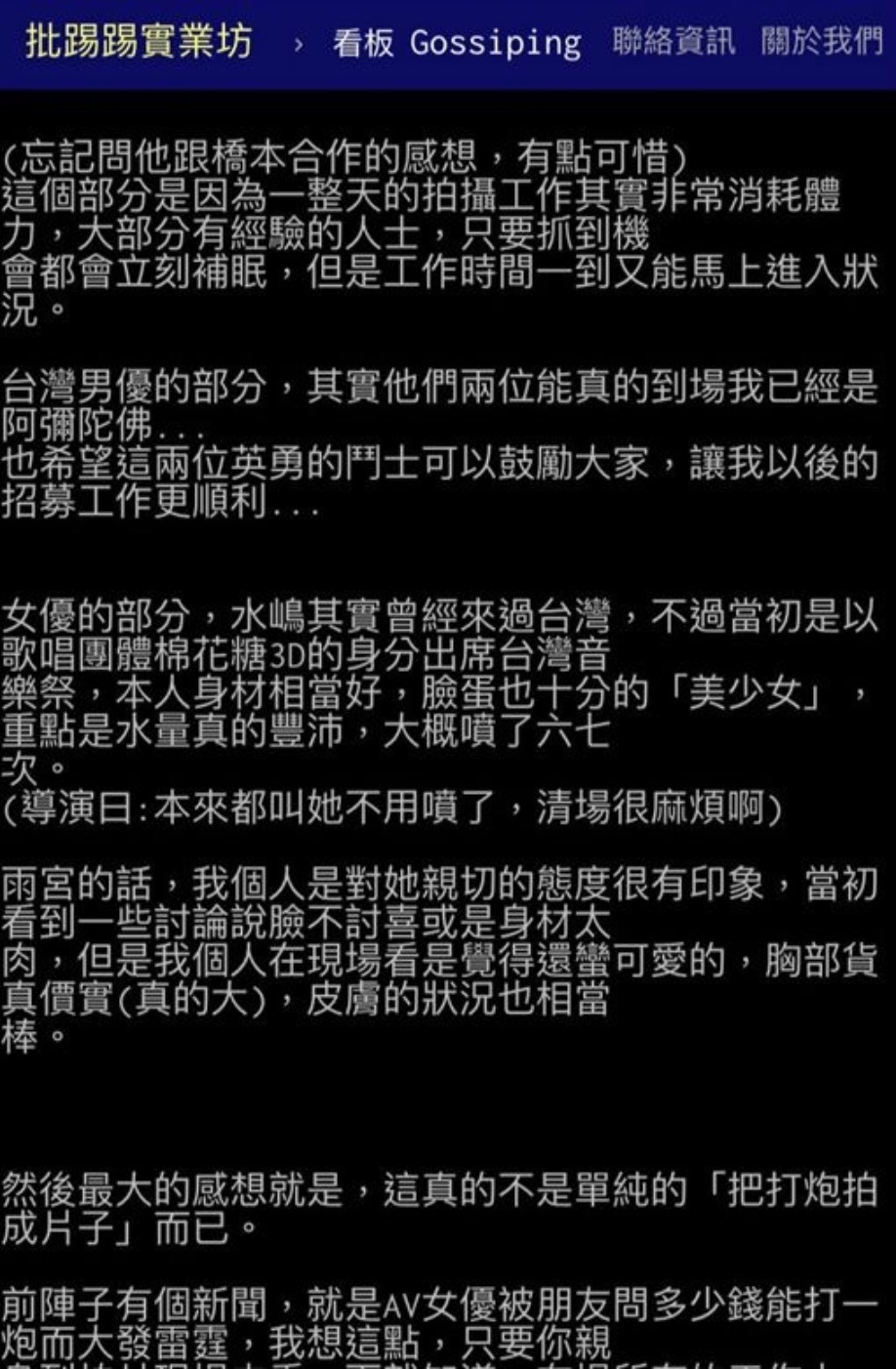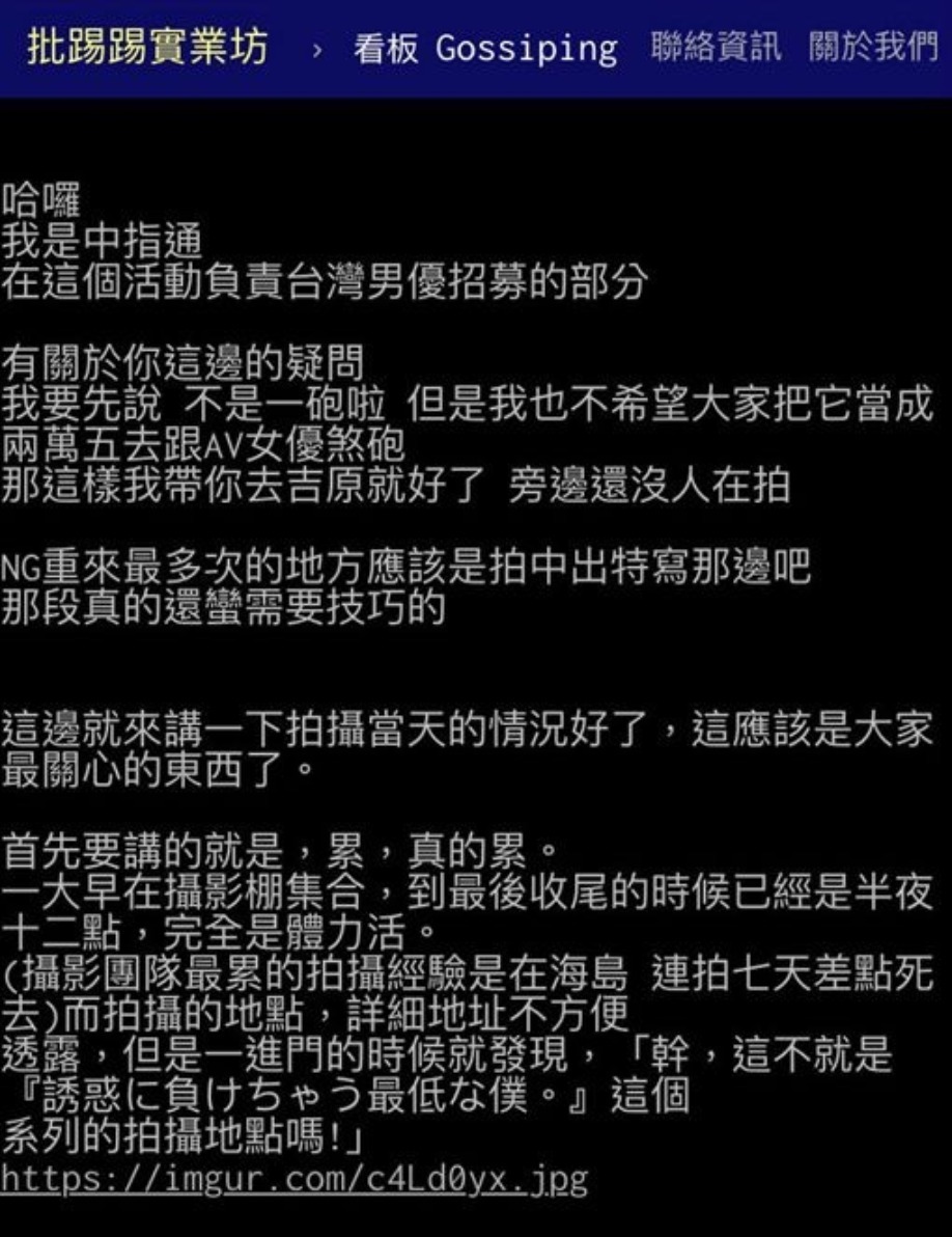負責招募男優的「中指通」在PTT上貼文,詳細描述了當天的過程說著...「我也不希望大家把它當成兩萬五去跟AV女優打炮」並透露兩台男當天拍攝時,NG重來最多次的地方應該是拍「中出」特寫,由於需要技巧NG 重來最多次,此外,過程中到處都是小眉角,像男優突然軟掉,導演就會立即移到接吻鏡頭,女優也會專業地用雙手替對方「重建雄風」,同時他也親眼目睹調製「假精」的過程令他大開眼界!