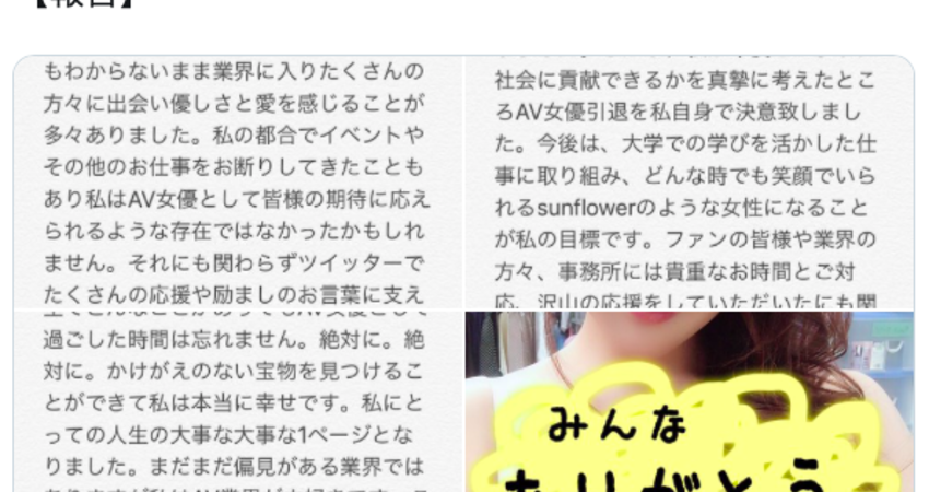 ideapocket出道、曾經在アタッカーズ(Attackers)以及セレブの友等片商擔任專屬女優的柚月ひまわり(柚月向日葵)在twitter上宣布了引退的消息,月底,她就要結束為期2年4個月的旅程,正式卸下AV女優的身分: