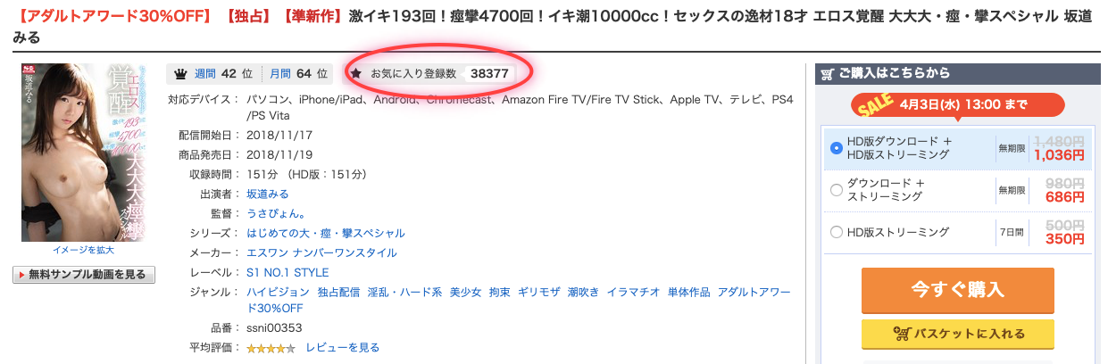那就是她之前的作品「エロス覚醒 大大大・痙・攣スペシャル」在網路FANZA(就是DMM)的按讚人數已經正式超過河北彩花的出道作,目前已經有38377人喜歡這支作品了~