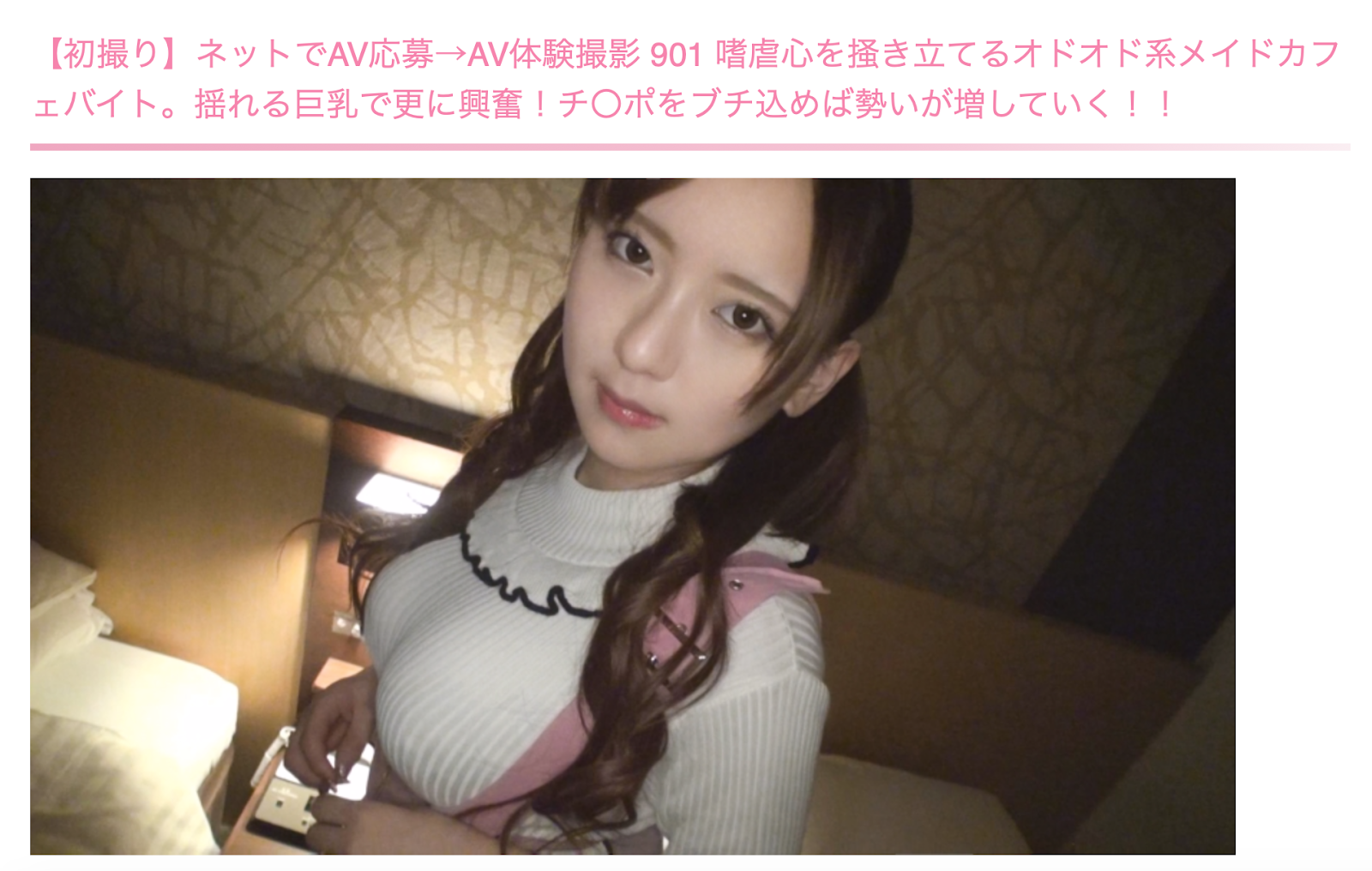 老司機們應該都知道這意味著女優有問題,不過還好,比照臉蛋我們可以找到她在AV先修班MGStage的作品「【初撮り】ネットでAV応募→AV体験撮影 901 嗜虐心を掻き立てるオドオド系メイドカフェバイト。揺れる巨乳で更に興奮!チ〇ポをブチ込めば勢いが増していく!!」,這片已經發售了,直接看就知道問題所在了: