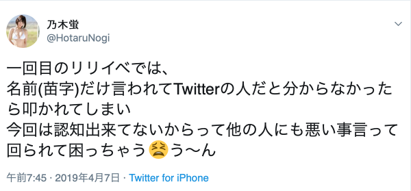 事後有不少女優為她打氣,也提到要記住所有粉絲的名字並不是容易的事。其實乃木蛍算是認真的女優了,你在twitter留言她都會想辦法回覆,沒多久就累積了好幾千則留言。但說真的,在twitter和影迷你一言我一語的是一回事,在活動上認人又是另一回事,記人除了要考慮女優認不認真我認為也是天生的本事,有些人就是過目不忘有些人就是天生臉盲會把馮京認成馬涼: