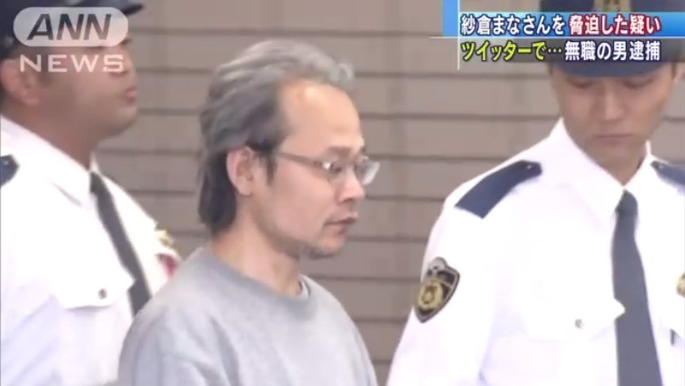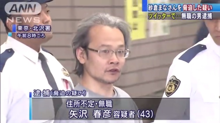 嫌犯是居無定所、也沒有工作的43歲男性,頭髮半白、一臉鬍渣的他面對鏡頭時面無表情,日本警方目前也在調查他騷擾紗倉まな(紗倉真菜)的動機,到目前還沒有公布結果~