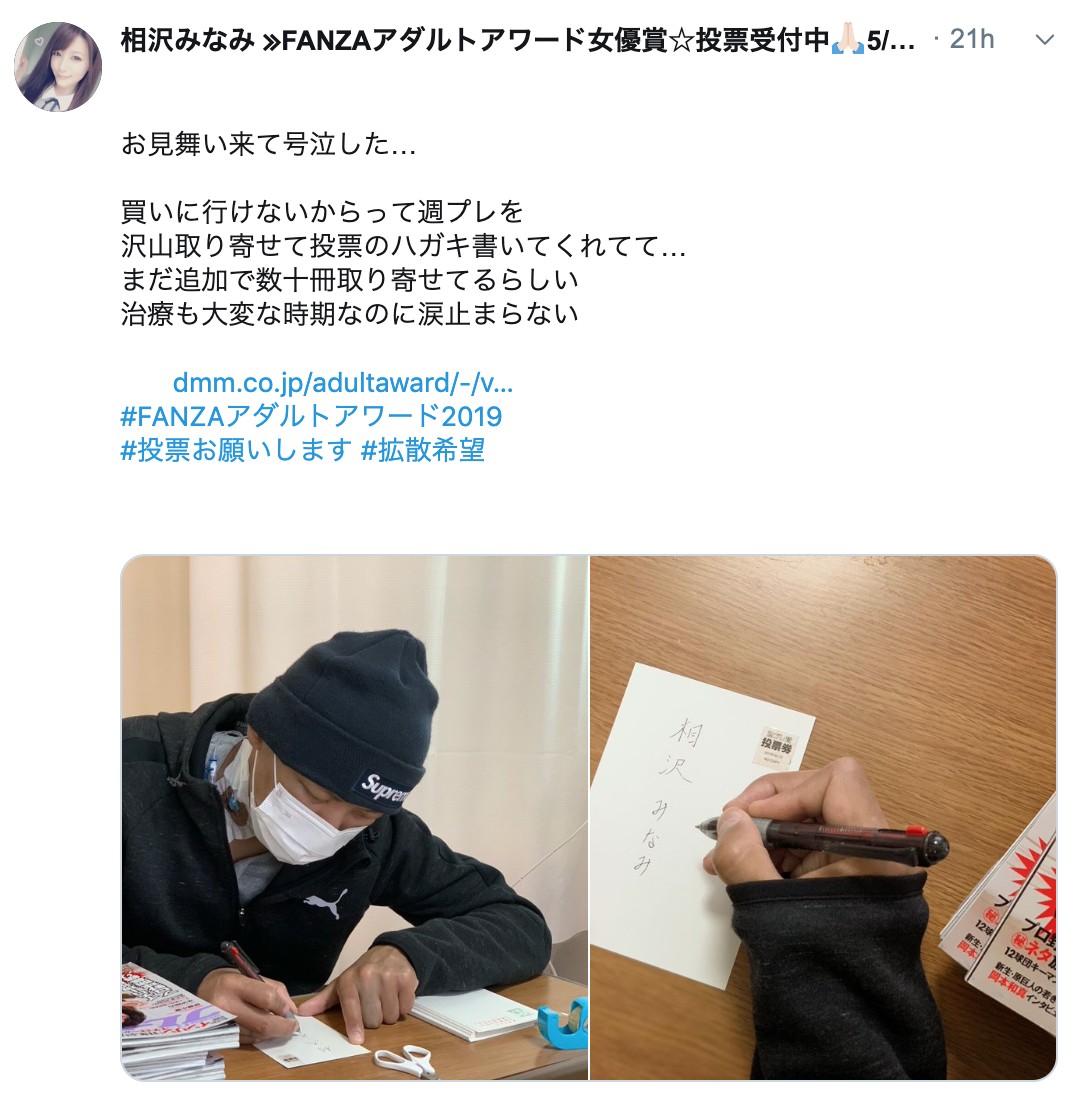 他們現在的目標就是FANZAアダルトアワード(FANZA成人大賞)的最優秀女優賞,社長甚至已經講出「這是我人生最後的希望」這種話,先不管相沢みなみ(相澤南)之後有什麼打算,同情心氾濫的我真的希望這次她能上台領獎,也希望大家不嫌棄的話能幫幫忙~
