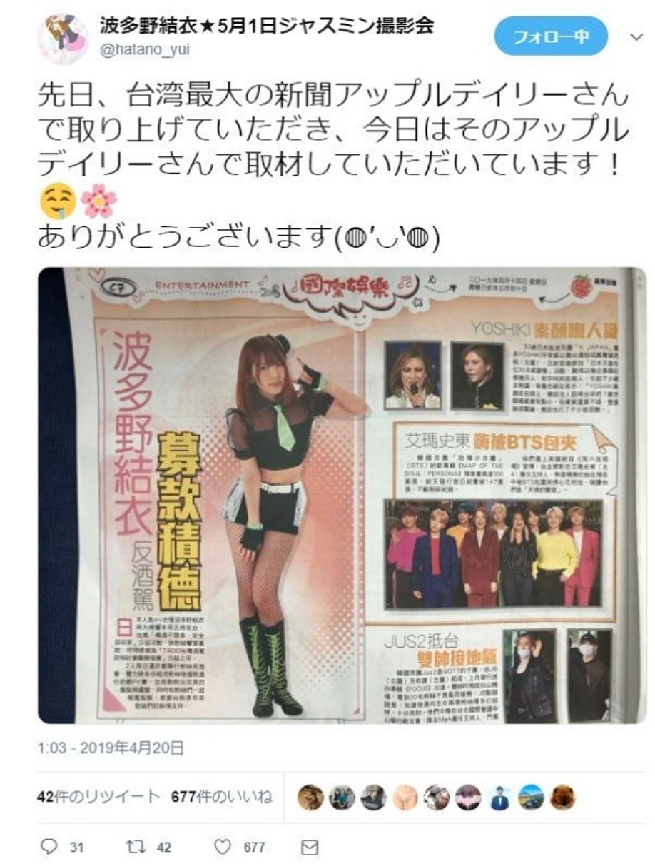 對於台灣人來說,波多野結衣一直是男性心中的「D槽女神」,這次迎接出道10周年特地與好友大槻響一同來台舉辦見面會。而波多野結衣與大槻響上《三立新聞網》直播節目「安安大明星」,剛好遇到在新聞台實習「一日記者」的邰智源,邰智源一看到2位AV女神立刻「暴衝上台」進行訪問,還趁機偷吃女神豆腐:「請跟我握手,好香喔」,逗得2位女神哈哈大笑。