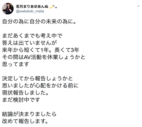 曾經來台參加成人博覽會、也舉辦過攝影會的若月まりあ(若月瑪麗亞)稍早前在twitter發表了休業宣言,可能明年,她就不拍了。