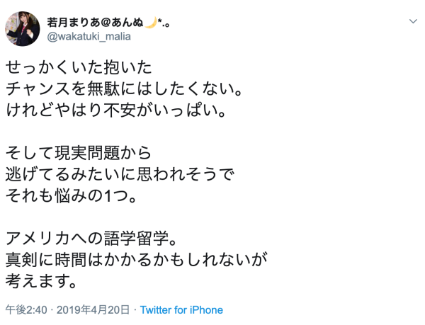 文章一開始她就說了,這是為了未來做打算,也沒錯啦,AV不能演一輩子,若月まりあ(若月瑪麗亞)在這一行也待了超過5年,如果沒辦法突破提升人氣與買氣是該要思考退役的問題。至於未來想幹嘛呢?若月まりあ(若月瑪麗亞)在隨後的發文告訴大家,她很認真地思考要去美國短期遊學,希望能增廣見聞並且加強語文能力~