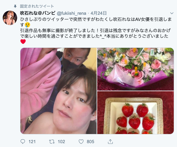 從吹石れな(吹石玲奈)上傳的照片就可以看到片商特別為她準備了花束和好吃的草苺,一旁還有爽完後一臉潮紅的男優貞松大輔等著替她種草苺。我想答案很清楚了,吹石れな(吹石玲奈)在之前就已經下定決心二度引退,片商知道她要封鮑了,所以才會特別去張羅那些東西來…