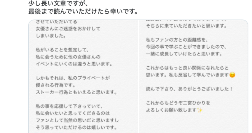 所以除非那影迷做了什麼我們不知道的事,我真的不知道他冒犯了二宮ひかり(二宮光)什麼;不過話說回來,大部分的女優都很怕影迷出現ストーカー(跟蹤騷擾)的行為,一來是她們大多不認為自己是公眾人物,有些人就算出道一陣子了還是不習慣被影迷追的感覺;二來經紀人沒辦法時時刻刻保護她們,再加上日本之前幾起影迷翻臉傷害偶像的案子鬧得很大,誰也不想成為下一個受害者: