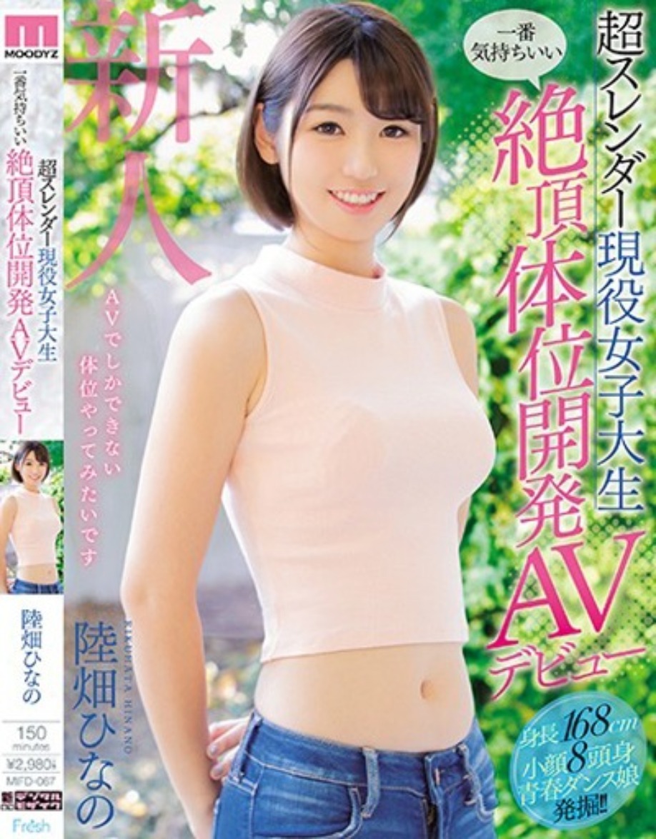 令和第一梯的美少女新人AV女優,號稱是一位現役女大學生,除了擁有168公分的8頭身長腿身材外,大D小E罩杯的美乳也是不容錯過的重點,臉蛋可愛、皮膚嫩白。陸畑雛乃的興趣是跳舞所以腰骨及身段可是非常軟Q,下海是為了想體驗除了AV以外平常無法嘗試的特殊做愛體位,內心的慾望之強烈,在預覽片中也能看到陸畑雛乃的騎乘位有多兇猛,自顧自地高速甩腰!