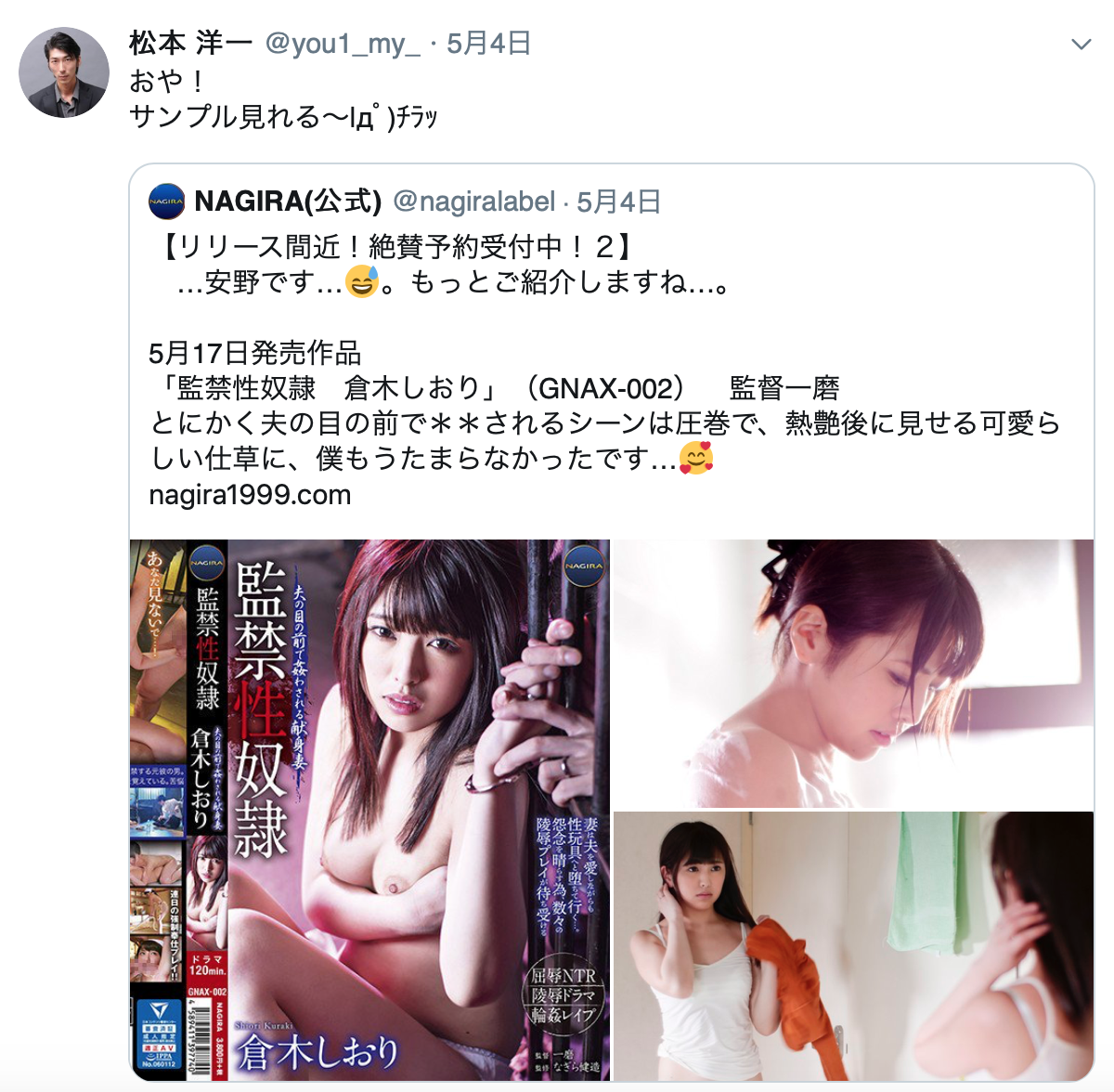 這樣講你就懂意思了,為什麼松本洋一在twitter上的自我介紹欄是寫「俳優」(演員)而不是AV男優呢?因為他是AV界的專業綠帽戶,出場就是為了要看片中的老婆在自己面前被侵犯的: