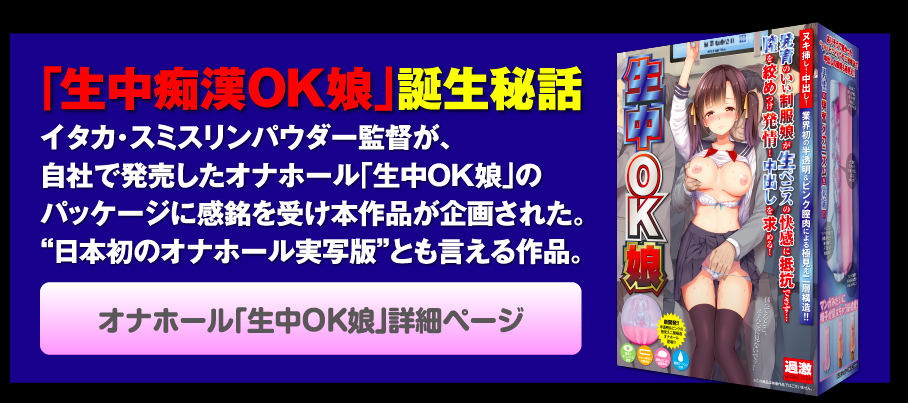 當然是一系列把女優搞得哇哇叫的作品:第一彈是「生中痴漢OK娘 絶対NGの極上娘を連日痴漢で大量中出しまでOKさせろ」這支2片裝、總共480分鐘的作品。這片可厲害了,ナチュラルハイ(Natural High)是怎麼完成這支作品的企劃?原來是看到自家出的自慰套「生中OK娘」的包裝而有了靈感,所以在作品的頁面寫下了這段話: