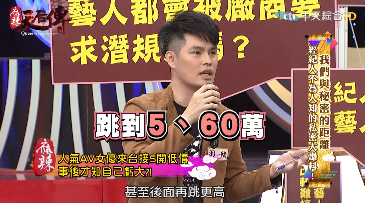 不想點連結也沒關係,讓小弟我為大家摘要一下:有位經紀人在電視節目「麻辣天后傳」爆料,有「神級女優」趁來台辦見面會時私底下偷接「S」(性交易),當時以為自己不紅只開出2萬元價碼,後來才發現虧大了,現在要搞她可能要付到50~60萬元了。
